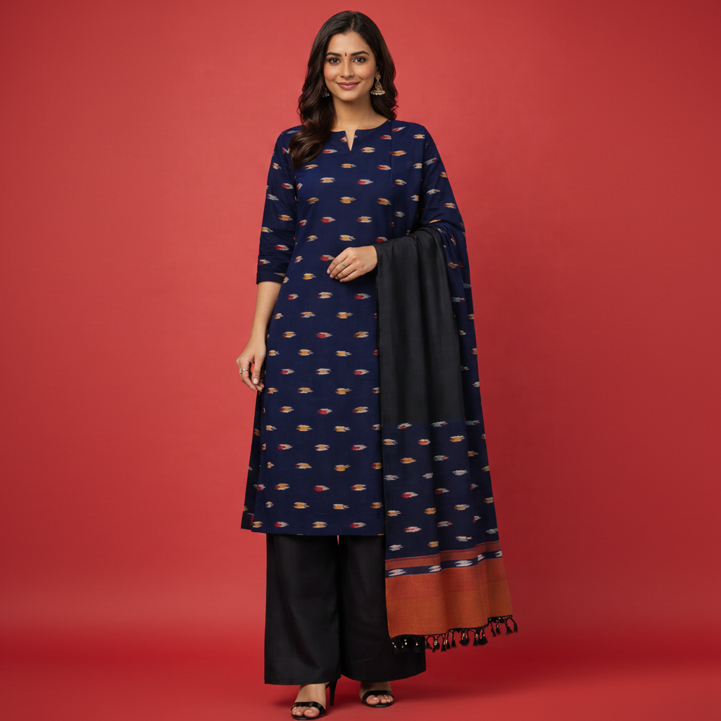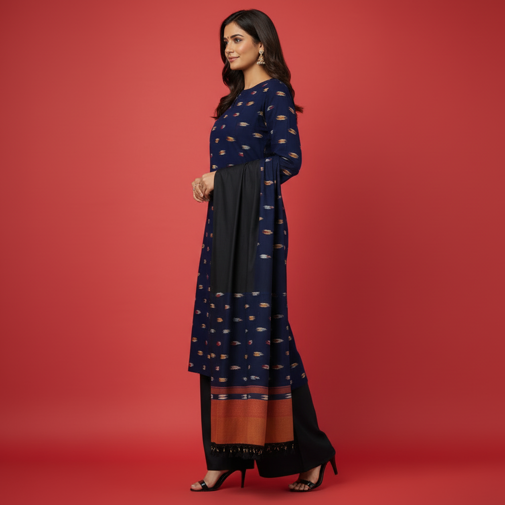 Pochampally Ikkat Blue & Black & White & Orange Wave Kurti Set
